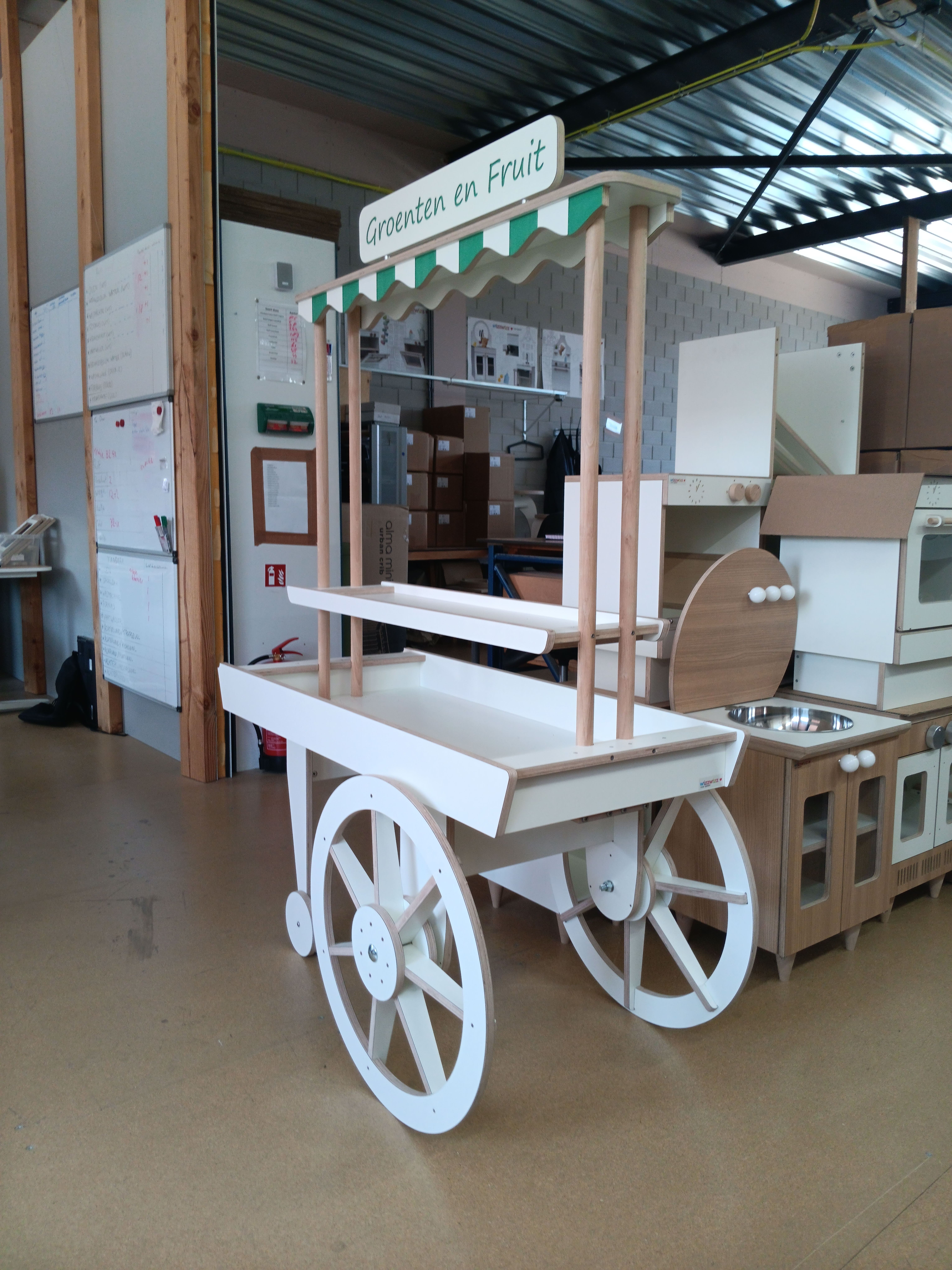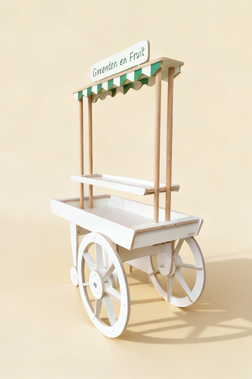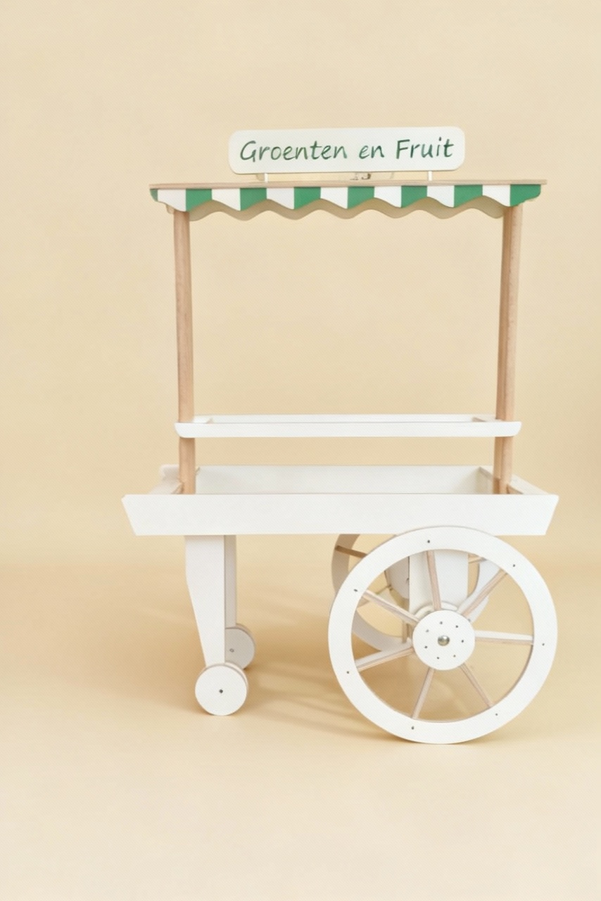 De marktkar brengt de vrolijke sfeer van de markt naar het klaslokaal. Met zijn frisse luifeltje en grote wielen nodigt hij kinderen uit om te ontdekken en te spelen. Vandaag is het een groente- en fruitkraam, morgen misschien een bloemenkar of een plek voor zelfgemaakte knutsels. Kinderen kunnen hun eigen winkeltje inrichten, samenwerken, verkopen, kopen en ondertussen spelenderwijs oefenen met taal, rekenen en sociale vaardigheden. De marktkar maakt leren leuk én levendig! (De tekst “Groeten en Fruit” op het paneel boven, kan op verzoek aangepast worden).